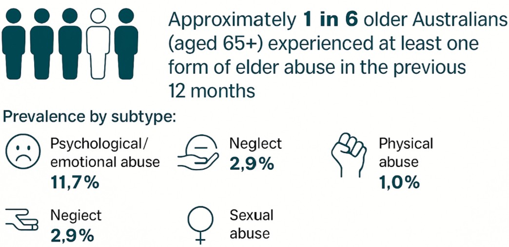 Addressing elder abuse is becoming more urgent, especially as populations in Australia grow older. This issue is often hidden, under-reported, complex, and can cause serious harm. As of June 2020, around 16% of Australia’s population was aged 65 and over, and it is expected to increase to about 23% by 2060-61.