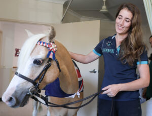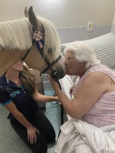 Patty’s journey to becoming a therapy pony began in a very different setting. He was first given to Ursula and her daughter, then attended a child’s birthday party as a unicorn. A friend who worked at Carrington recognised his gentle nature and suggested he might be a good fit for therapy visits.